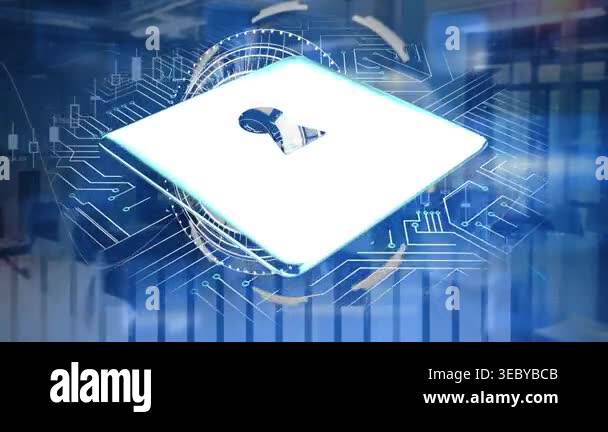 Animation of digital padlock and fingerprints over integrated circuit ...