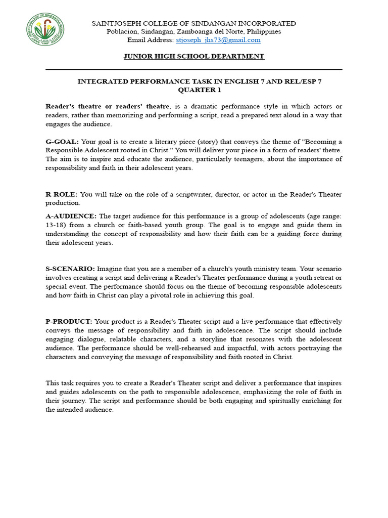 Integrated performance Task in Grade 7 - . HOLY CHILD ACADEMY OF PITOGO ...
