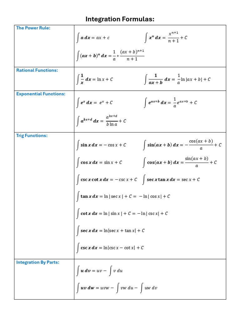 Integral Formula Sheet