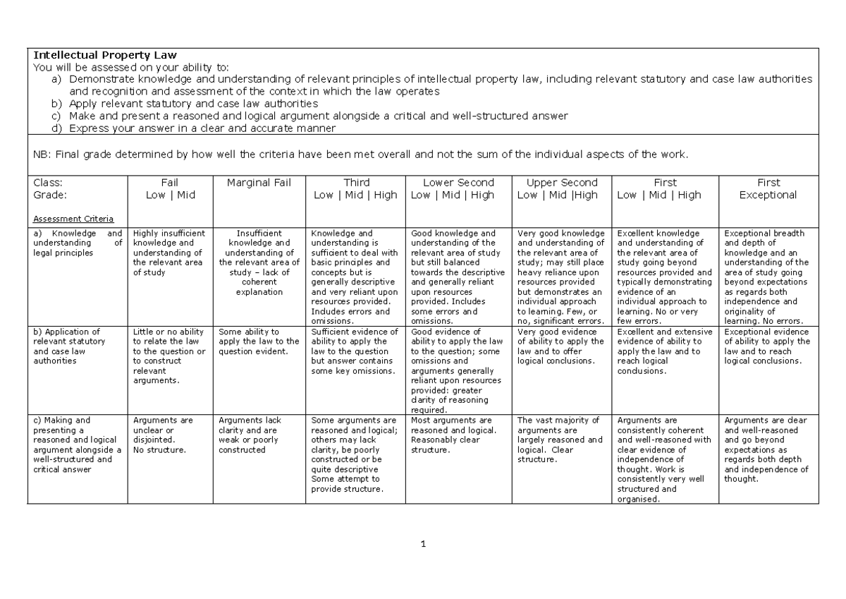 Intellectual Property Law LLB Marking Matrix - Final Year 2021 - Studocu