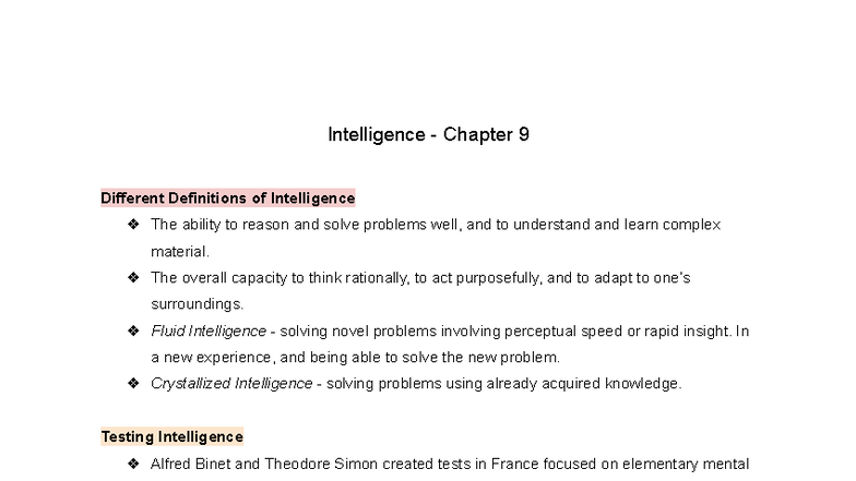 Chapter 9 - Intelligence: Definitions, Testing, and Theories - Studocu