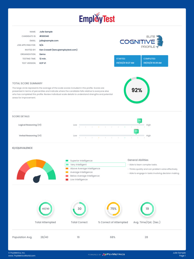 Elite Cognitive Profile V1 Sample Report | PDF | Reason | Intelligence