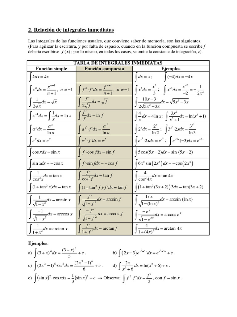Tabla de integrales inmediatas- con ejemplos | PDF