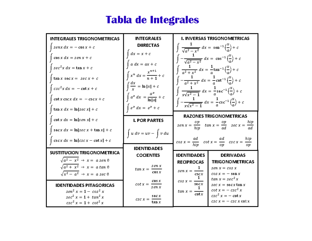 Tabla De Derivadas Integrales E Identidades Trigonometricas Pdf My