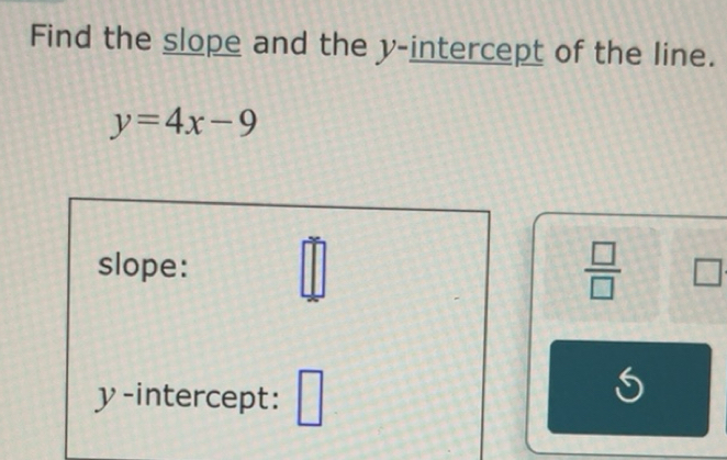 Solved: Find the slope and the y-intercept of the line. y=4x-9 slope ...