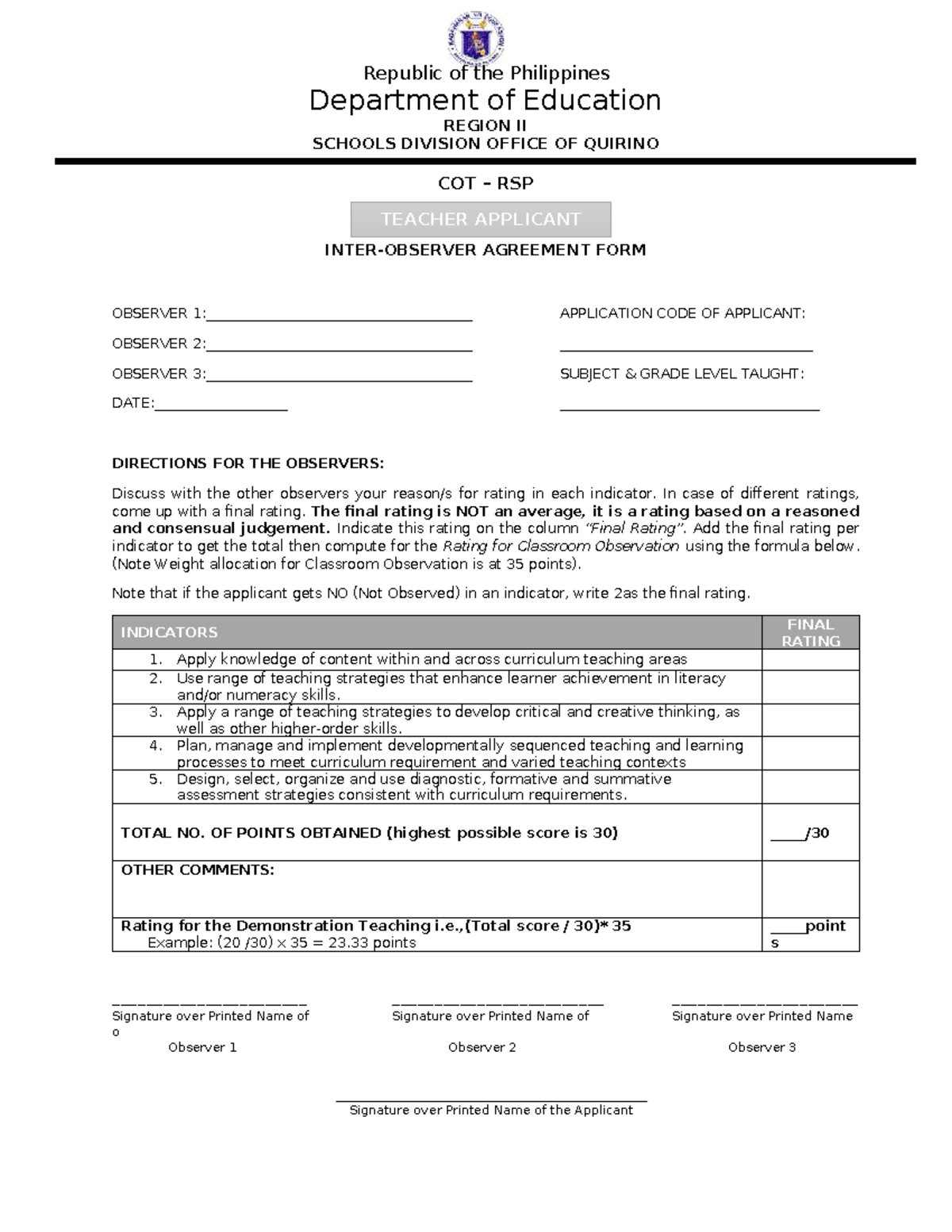 Inter Observer Agreement Form for Teacher Applicant Evaluation - Studocu
