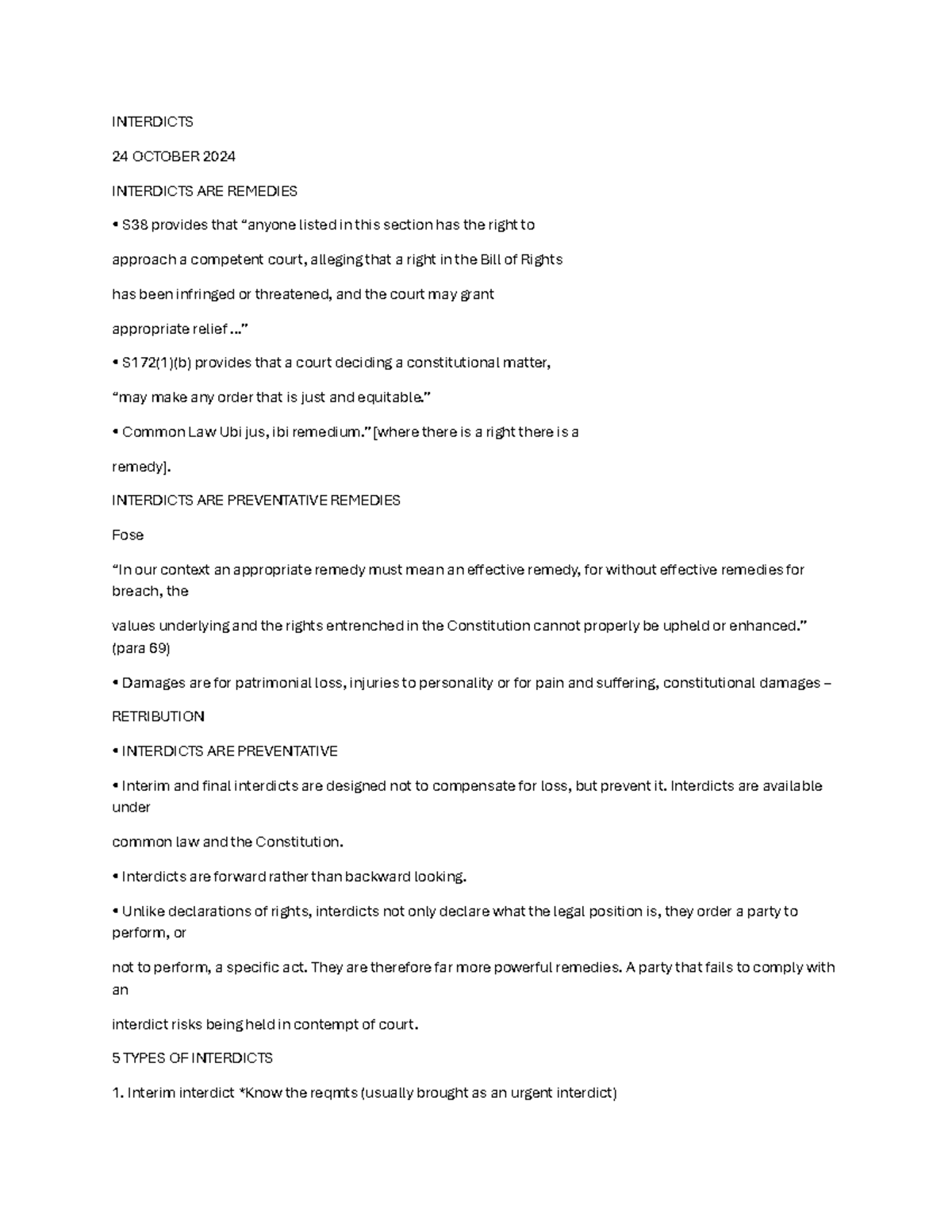 INTERDICTS.docx - INTERDICTS: Overview: An interdict is an order of ...