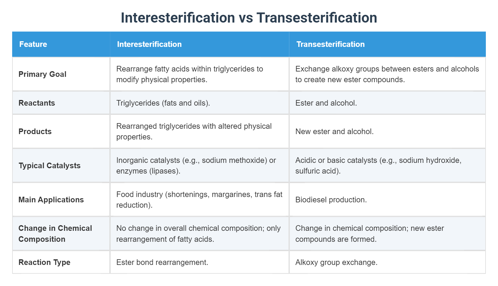 Interesterification vs Transesterification - Tabular Comparison