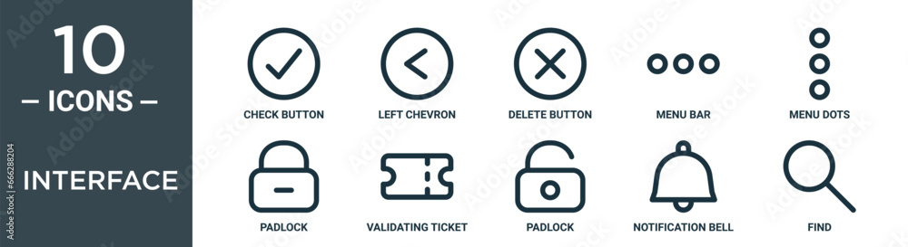 interface outline icon set includes thin line check button, left ...