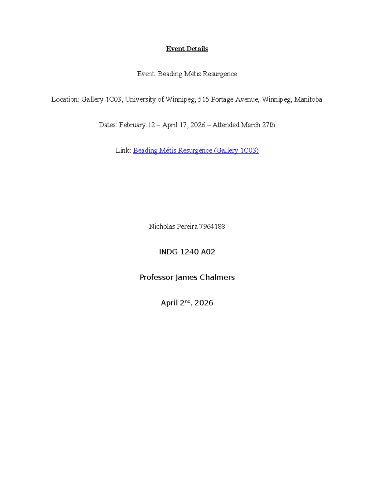 INDG 1240 A02 Essay Reflection: Beading Métis Resurgence Event - Studocu