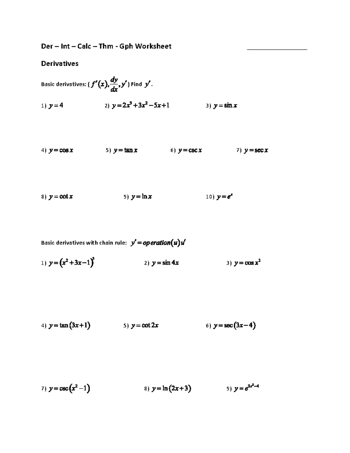 Rev Derivatives & Integrals Worksheet for Int Calc Thm - Studocu