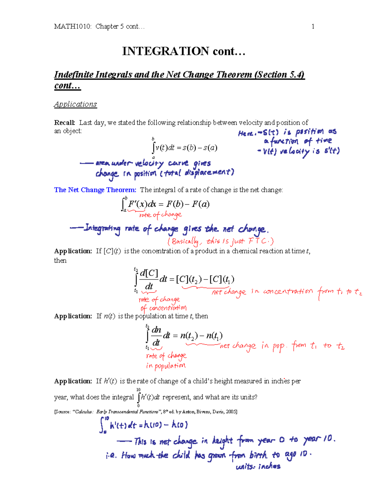 MATH1010: Chapter 5 - Indefinite Integrals & Net Change Theorem - Studocu