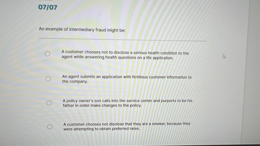 Solved: 07/07 An example of intermediary fraud might be: _ A customer ...