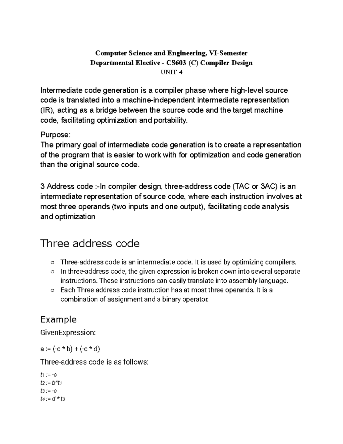 Compiler Design CS603 (C) Unit 4: Intermediate Code Generation Notes ...