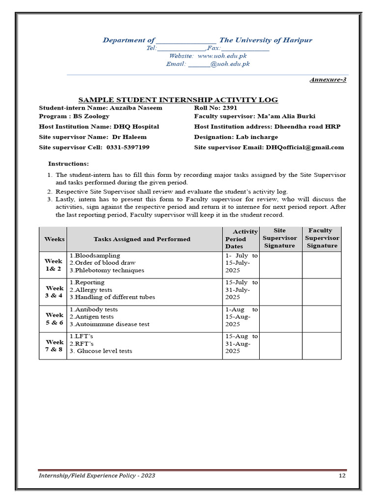 Sample Student Internship Activity | PDF | Blood | Clinical Pathology