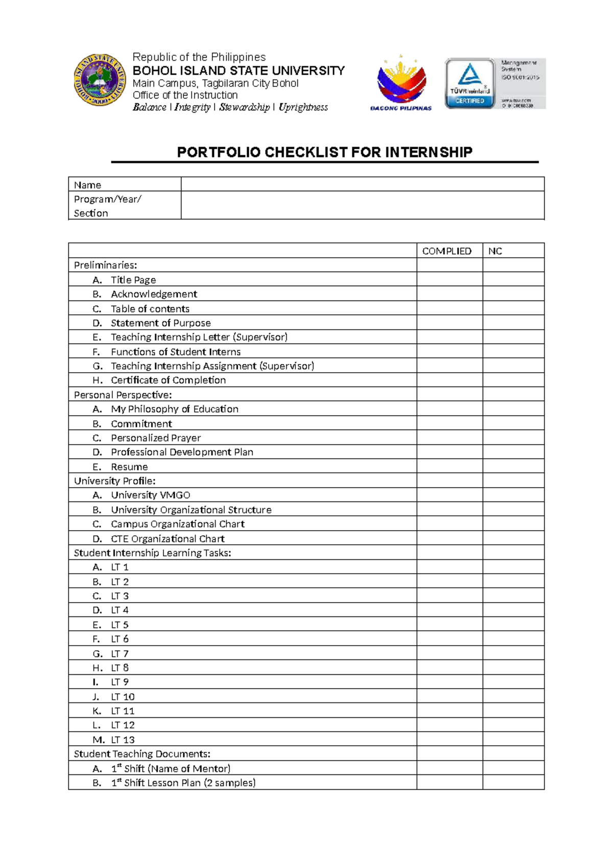 Checklist for Internship Portfolio - Bohol Island State University ...