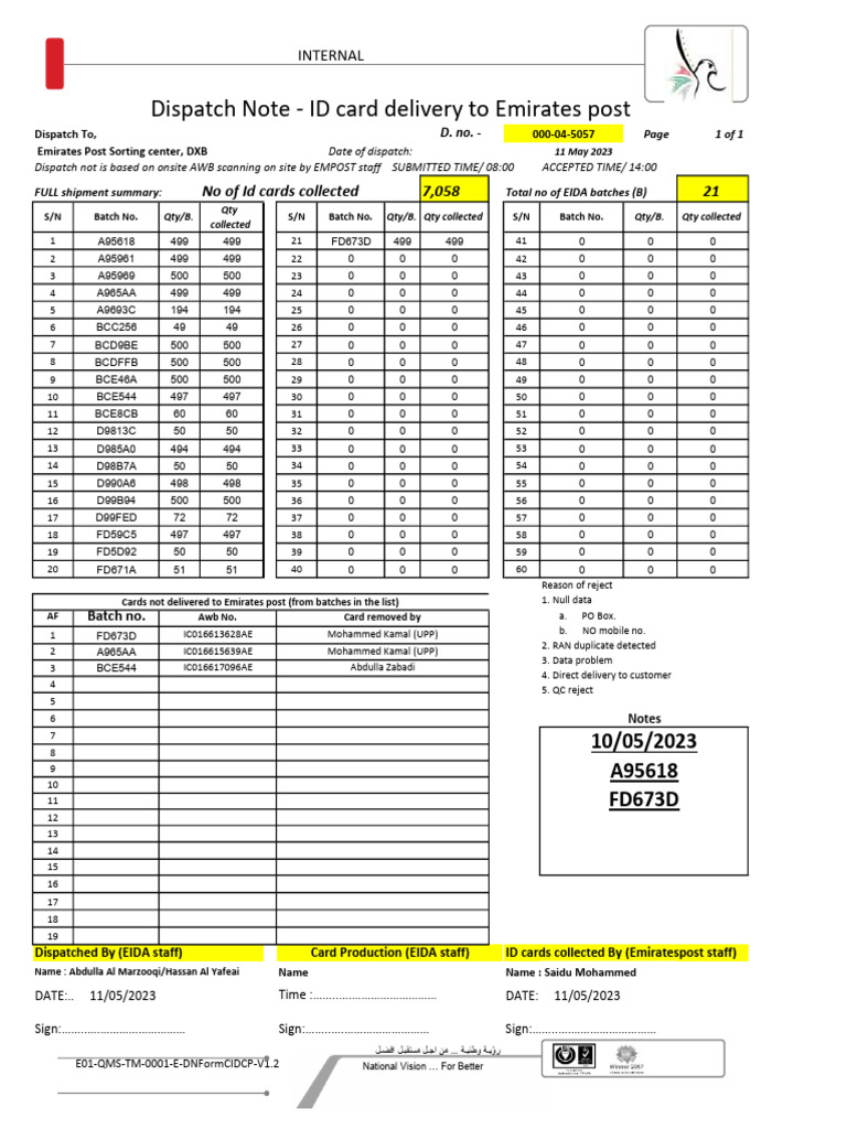 Dispatch Note - ID Card Delivery To Emirates Post: Internal | PDF