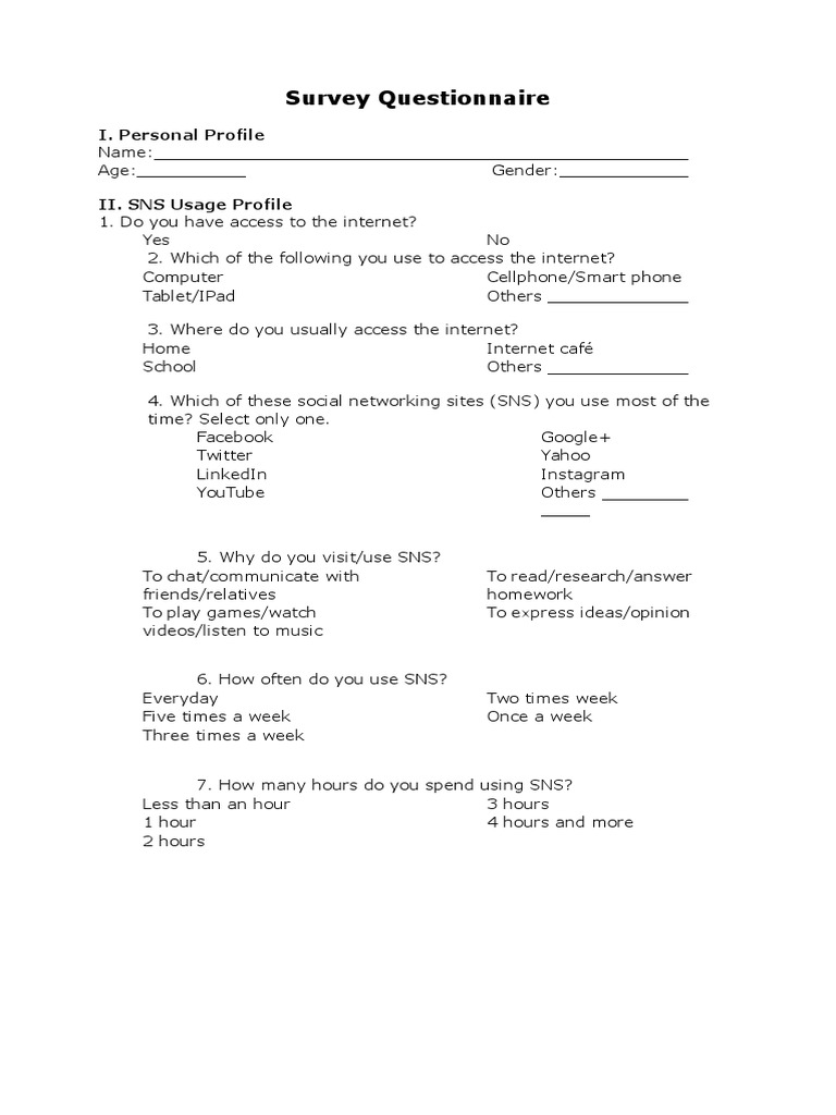 Social Networking Sites Questionnaire | Social Networking Service ...