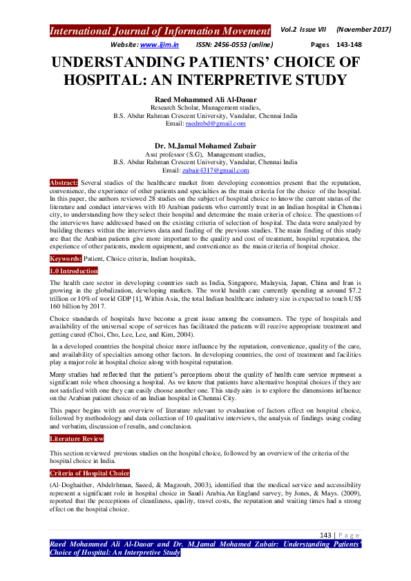 (PDF) UNDERSTANDING PATIENTS' CHOICE OF HOSPITAL: AN INTERPRETIVE STUDY