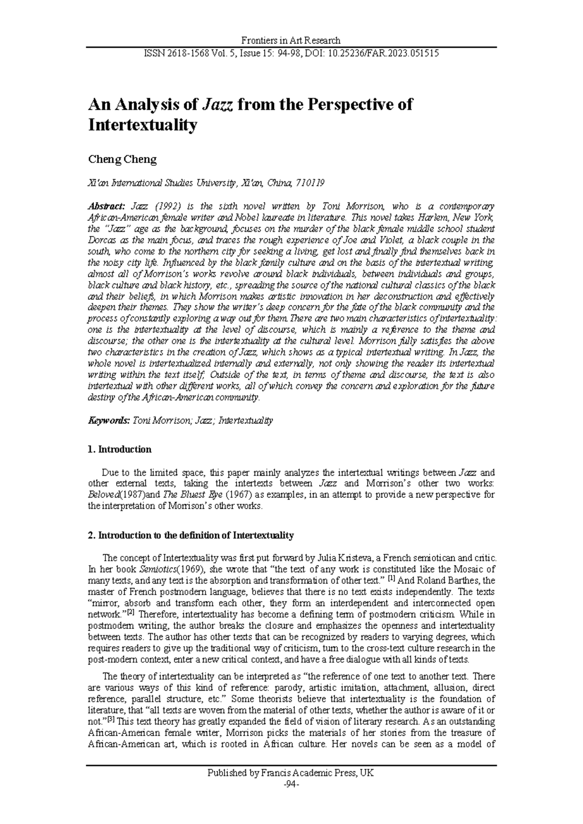 Intertextual Analysis of Toni Morrison's *Jazz* in Lit Studies (ISSN ...