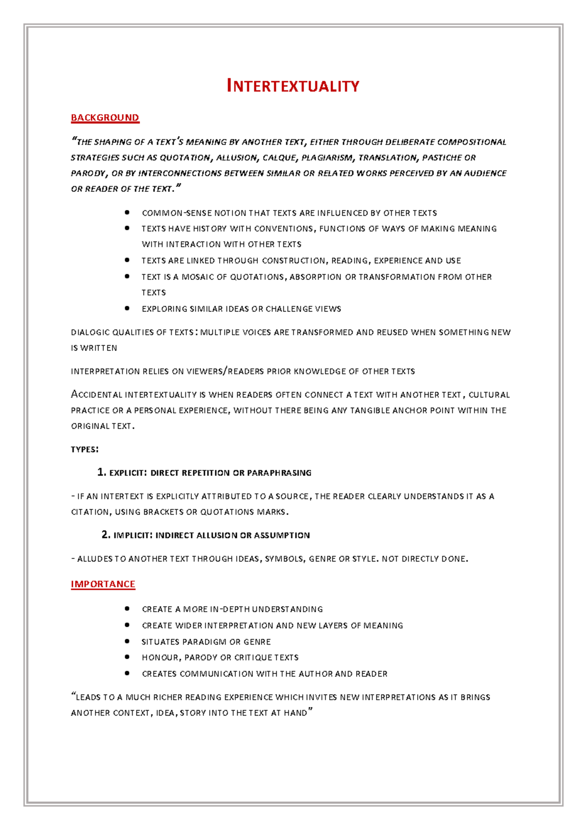 Intertextuality A1 Study Notes: Understanding Textual Connections - Studocu