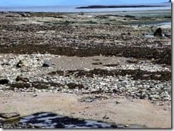 Colourful rocks and oysters line the intertidal zone on a beach on the ...