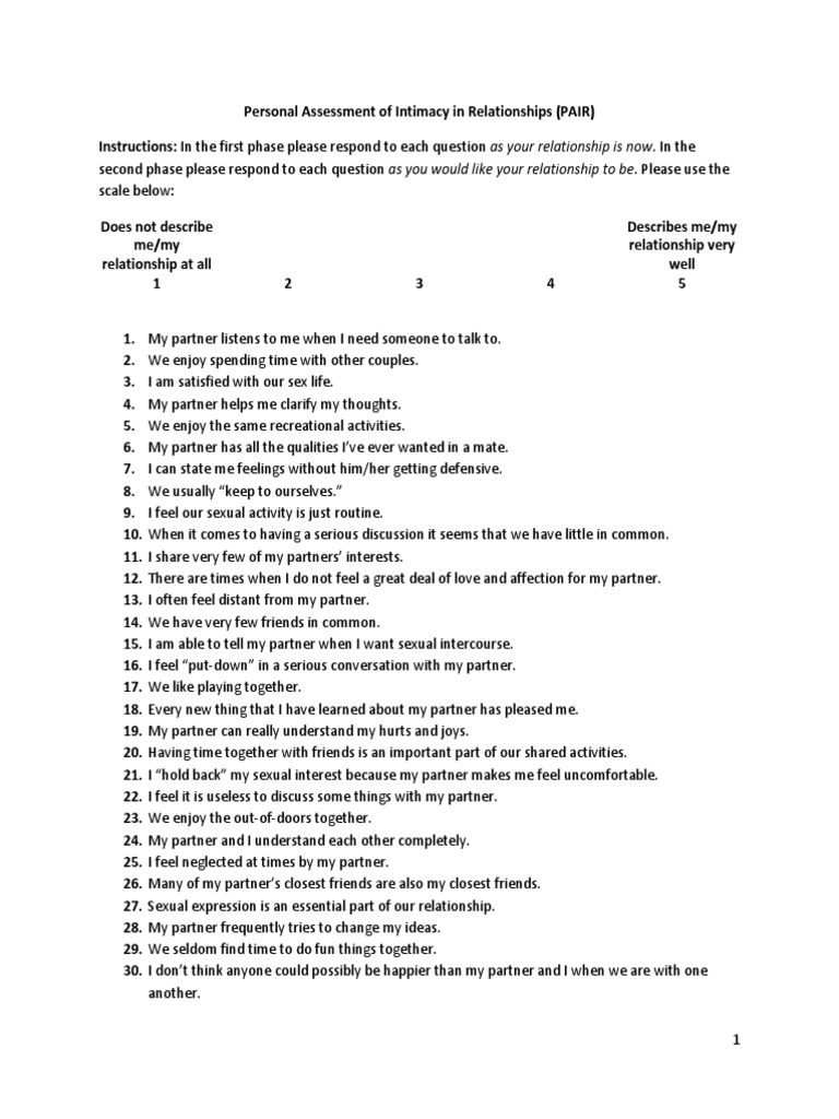 Personal Assessment of Intimacy in Relationships (PAIR) | PDF