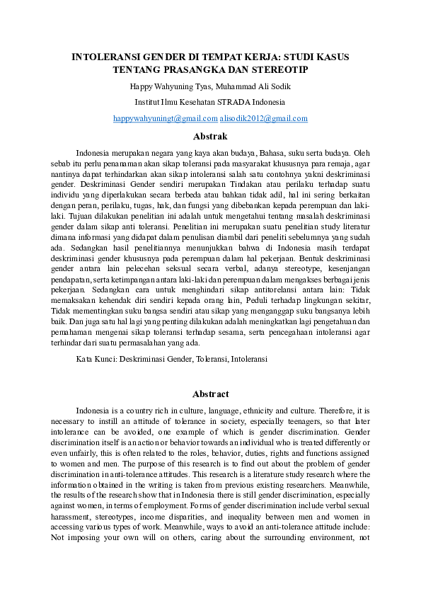 (PDF) INTOLERANSI GENDER DI TEMPAT KERJA: STUDI KASUS TENTANG PRASANGKA ...