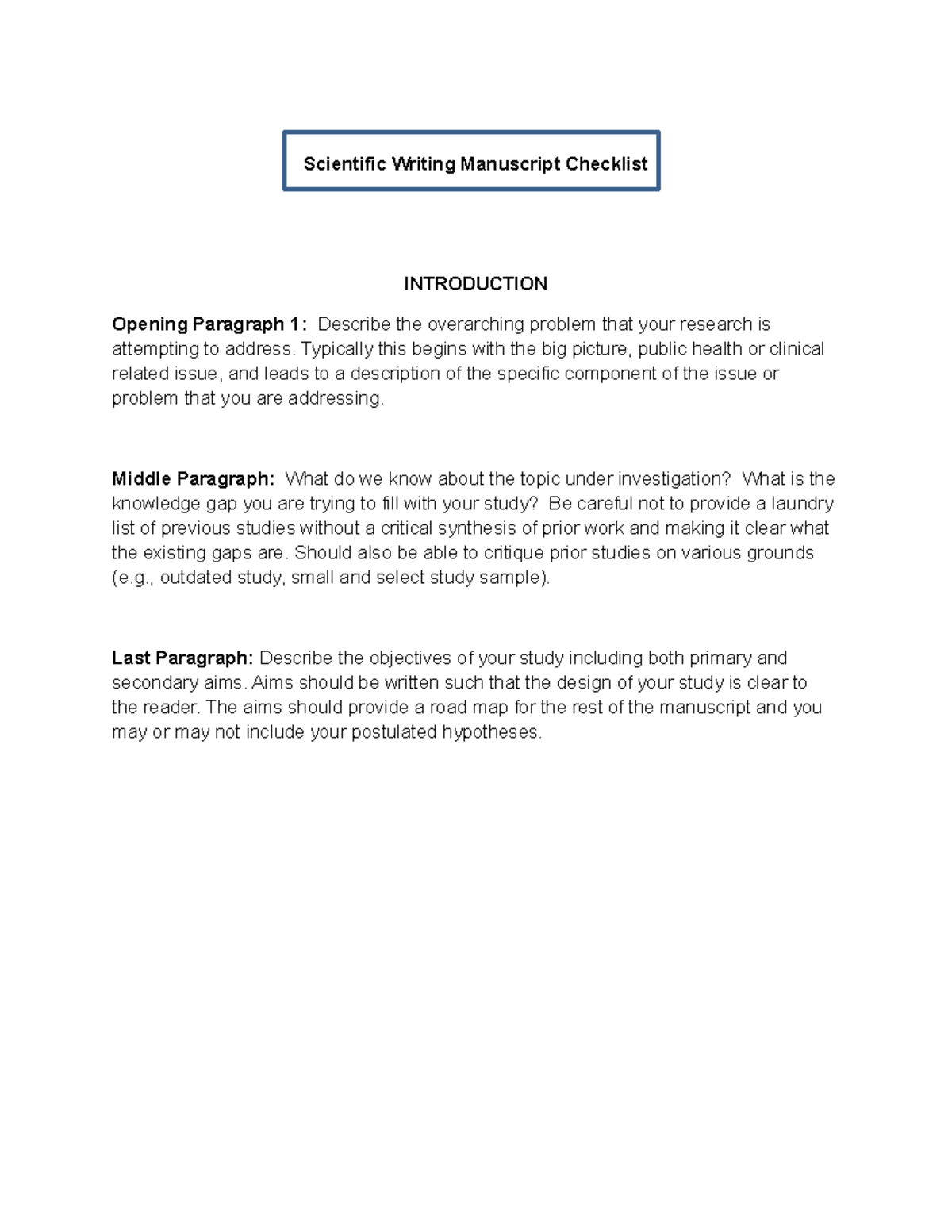 Scientific Writing Manuscript Checklist 4-13-17 - INTRODUCTION Opening ...
