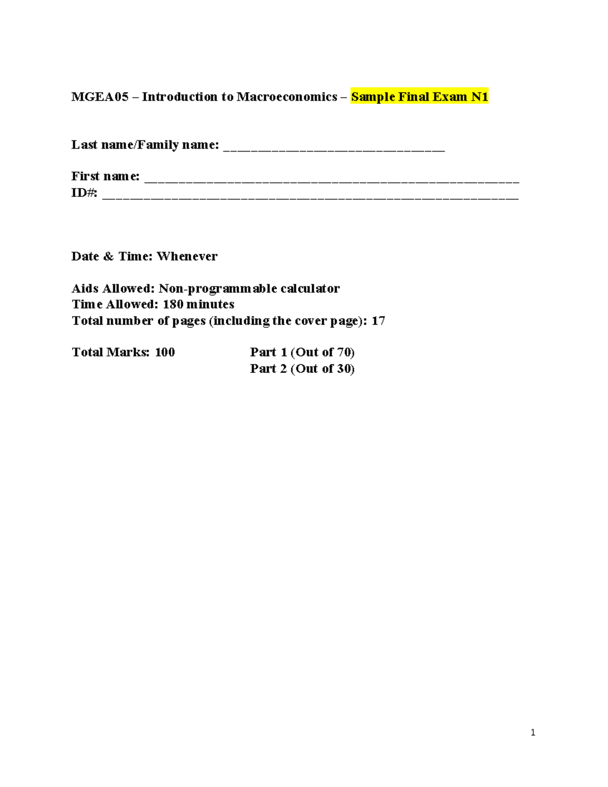 MGEA05 Introduction to Macroeconomics Sample Final Exam N1 Questions ...