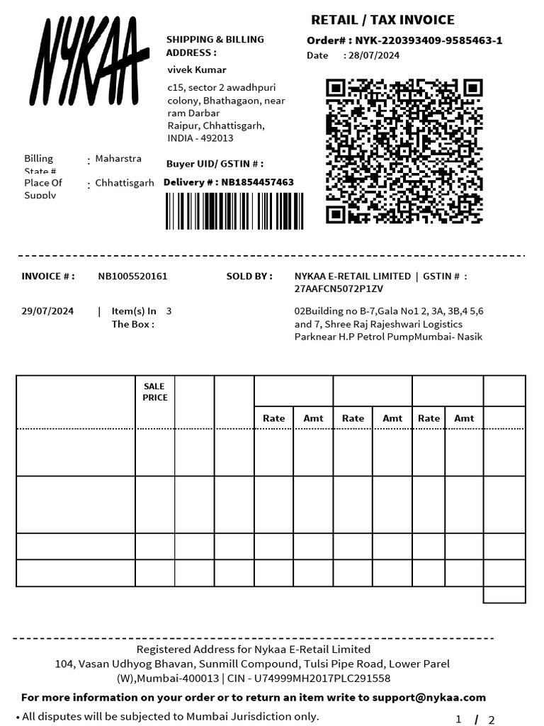 India Nykaa E-Retail Invoice Template In Word And PDF Formats 2 Page