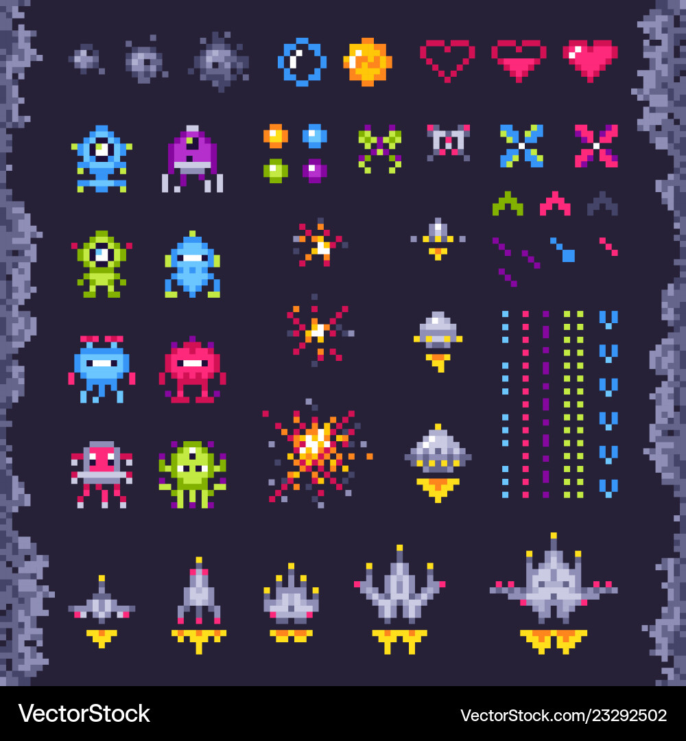 Retro pixel space invader game assets - 8 bit spaceships, alien ...