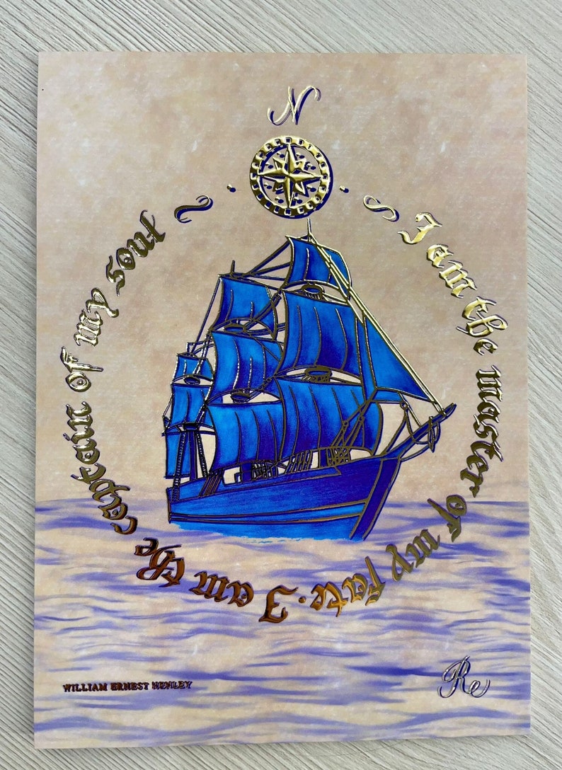 Invictus Poem Postcard: Illuminated Calligraphy, Blue Ship, Gold ...