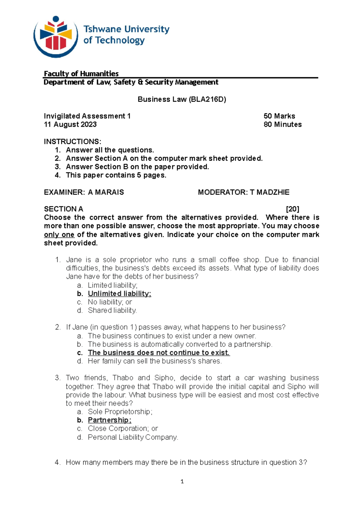 BLA216D Business Law Invigilated Assessment 1 Memo - August 2023 - Studocu