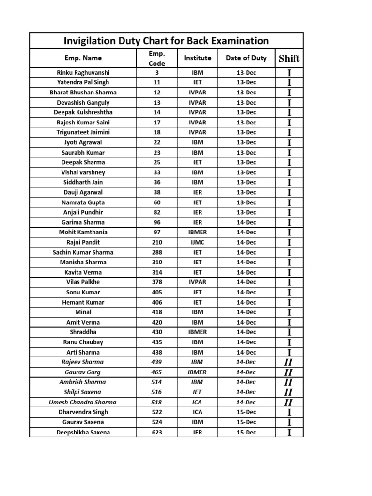 Invigilation Duty Chart For Back Examination: Shift I I I I I I I I I I ...