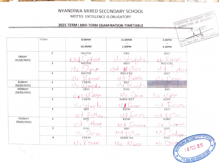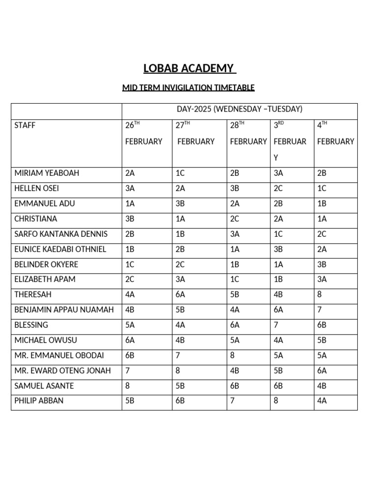 INVIGILATION TIMETABLE 20 Feb 2025 MID-TERM | PDF