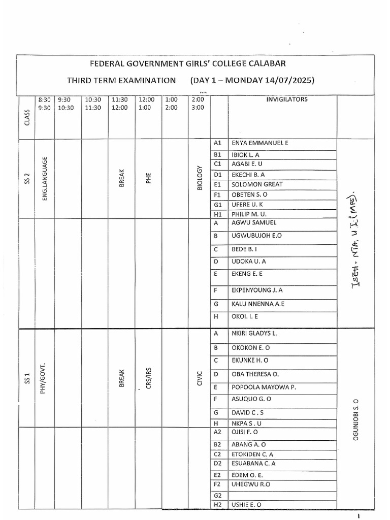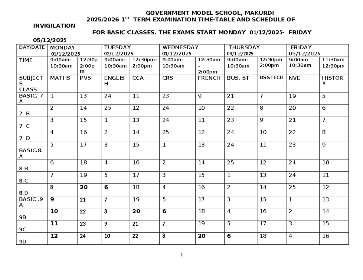 GOVERNMENT MODEL SCHOOL 1ST TERM EXAM TIMETABLE & INVIGILATION SCHEDULE ...