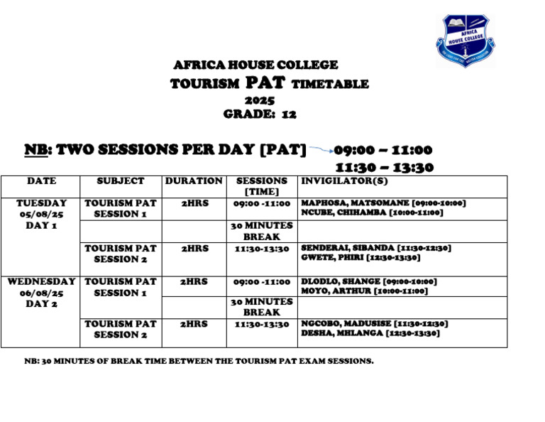 Invigilation Timetable-Tourism Pat GR 12-2 | PDF