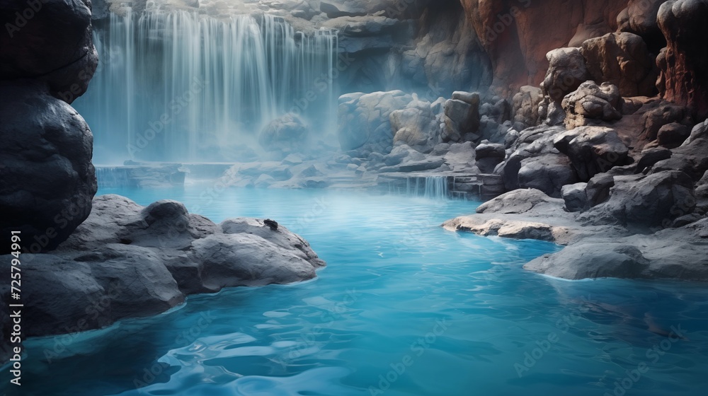 Premium AI Image | A natural hot spring with a waterfall in the background