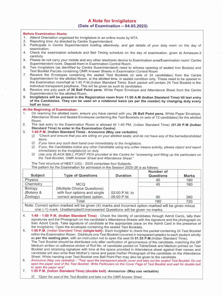 NEET (UG) - 2025 Information Kit For Invigilators (Reference Copy ...