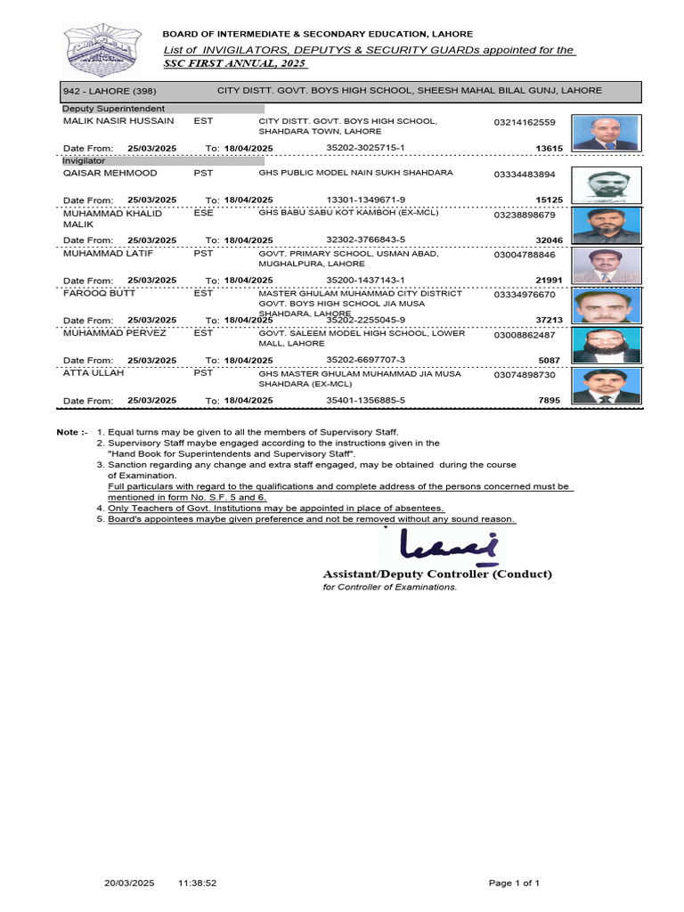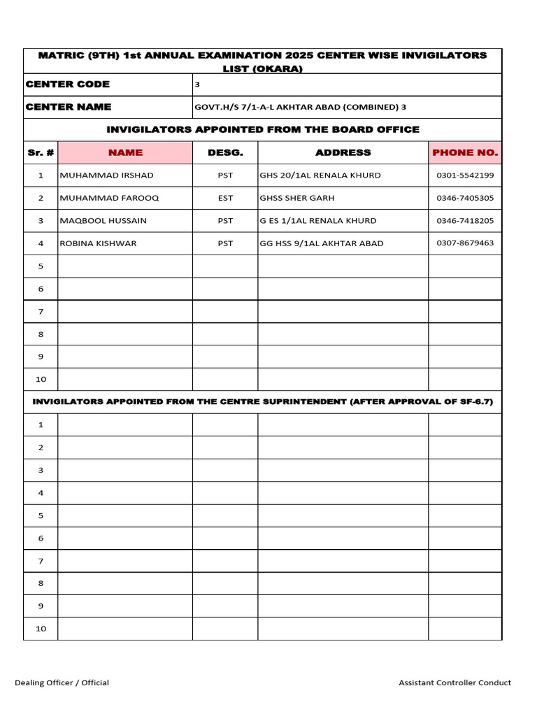 Matric Annual 2025 Invigilators List OKARA | PDF
