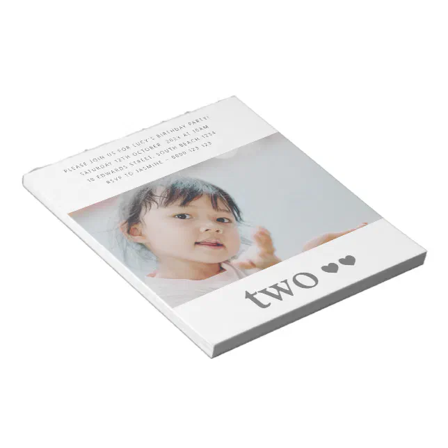 Photo Second Birthday Party Heart Invitation Notepad | Zazzle