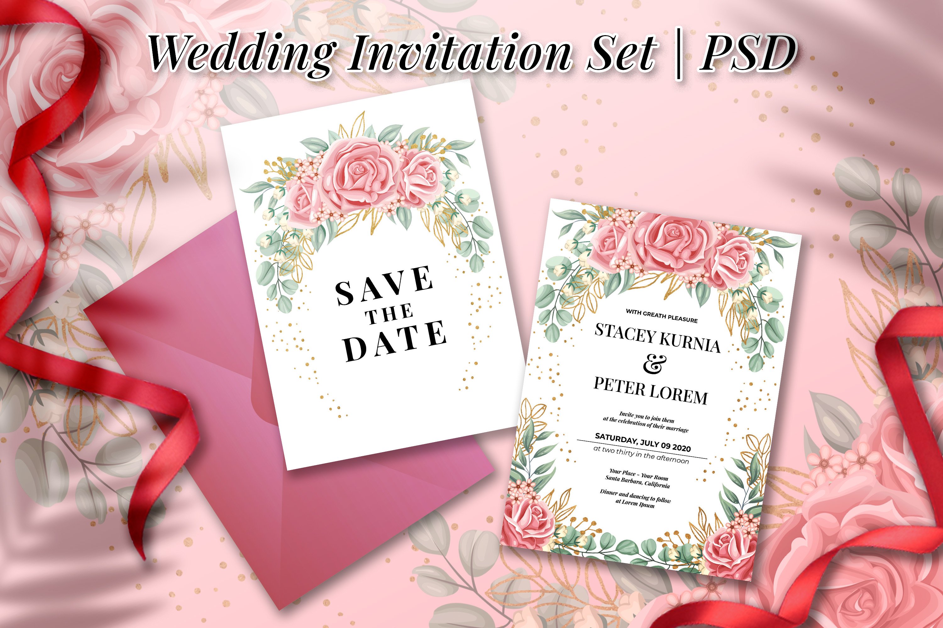 Premium PSD | A pink invitation for a wedding with pink flowers and the ...