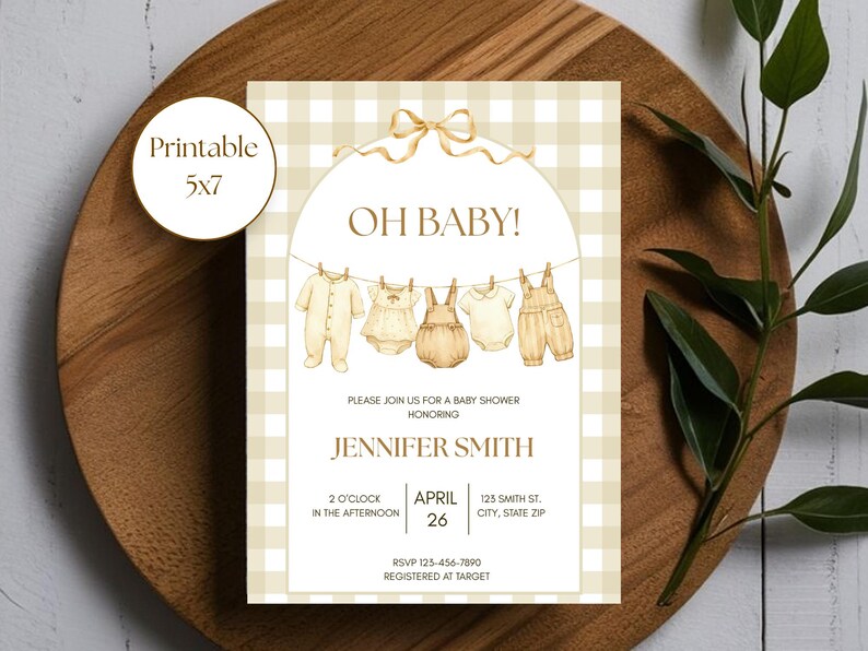 Boho Gingham Baby Shower Invitation, Editable Canva Clothesline Invite ...