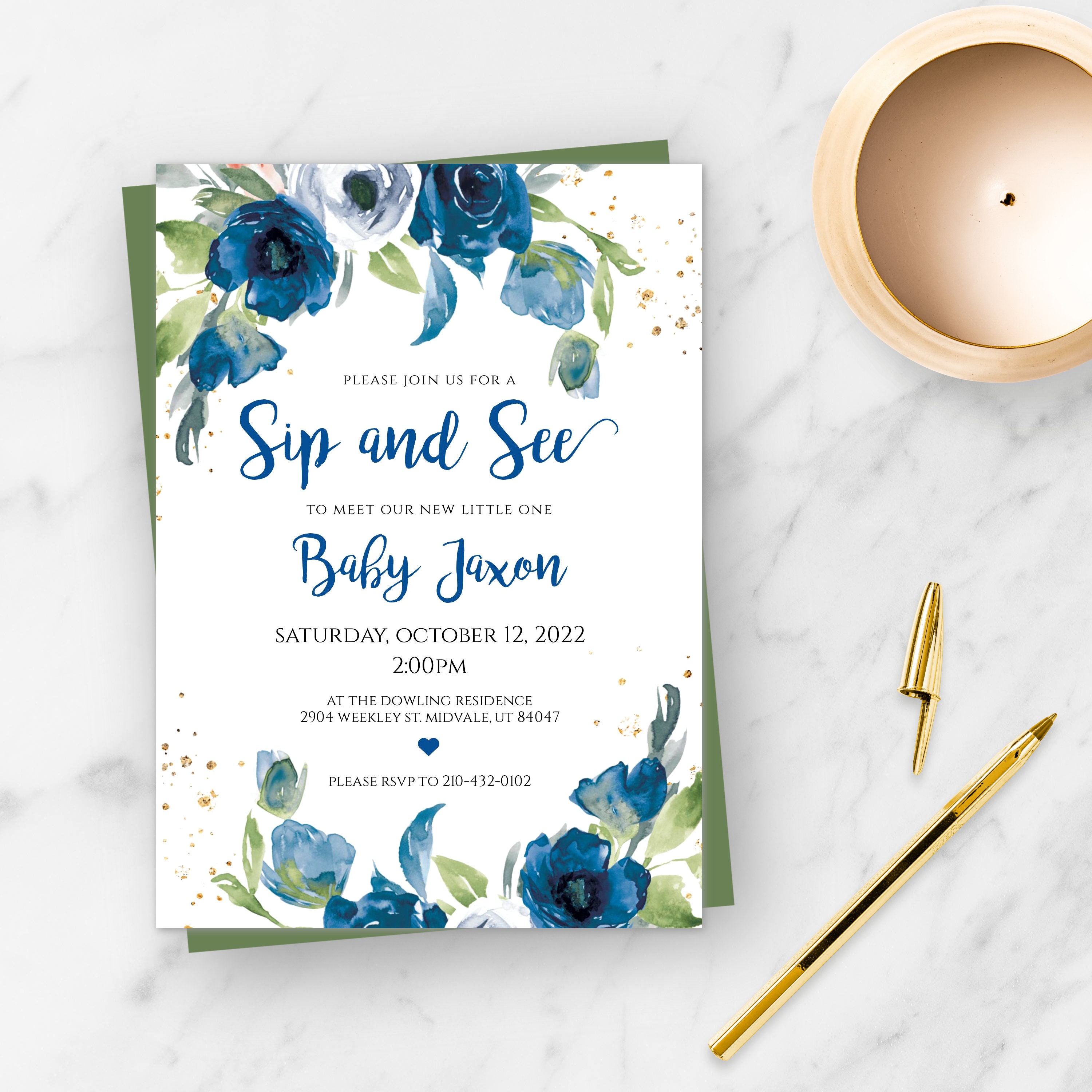 Sip and See Invitation Template for Boy Baby Shower, Blue Floral Meet ...