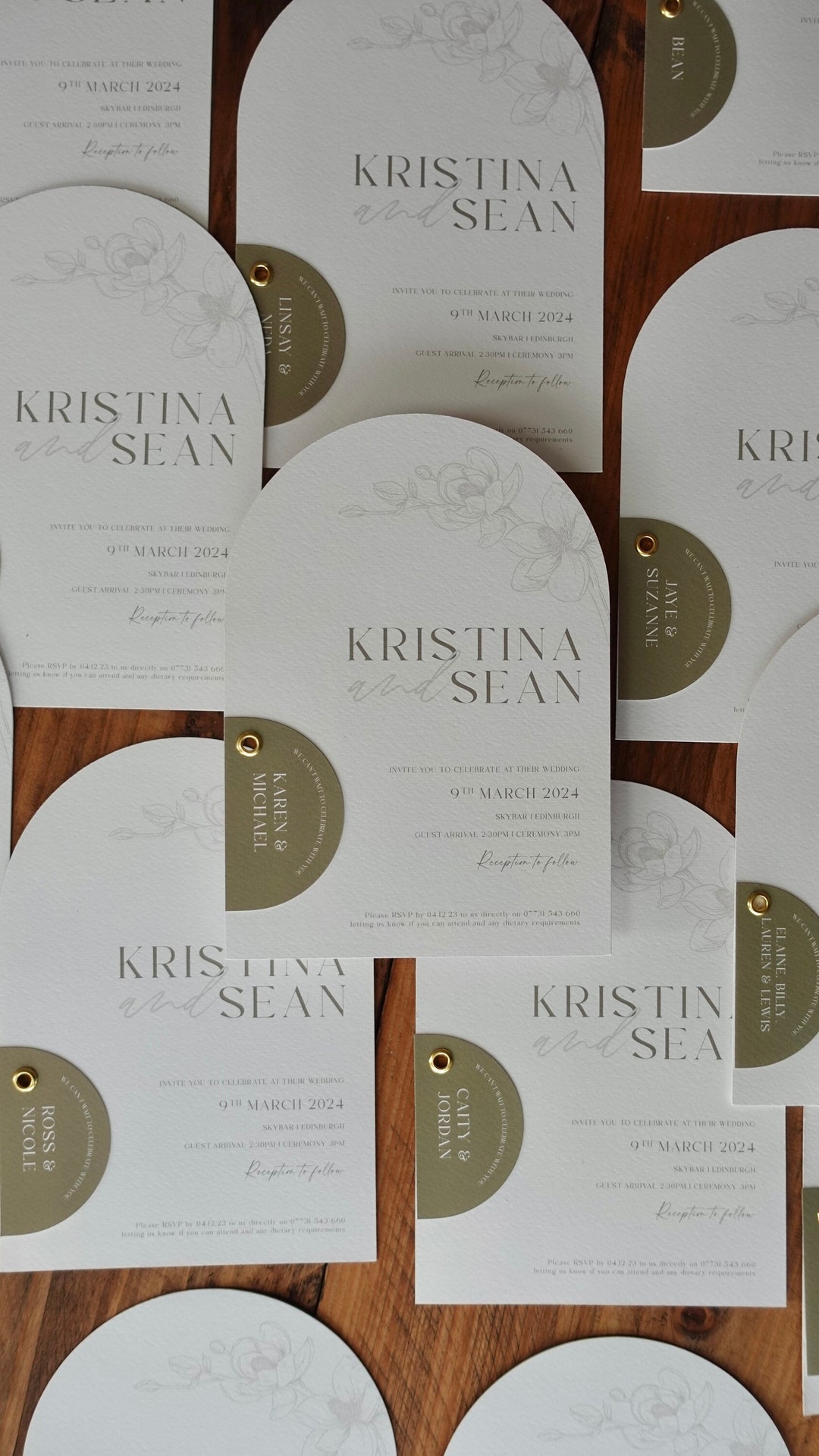Printed Arched Wedding Invite Cards, With Personalised Name Tag in Sage ...