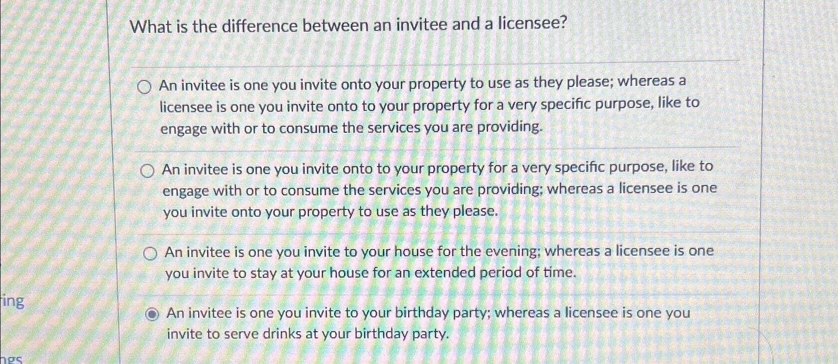 Solved: What is the difference between an invitee and a licensee? An ...