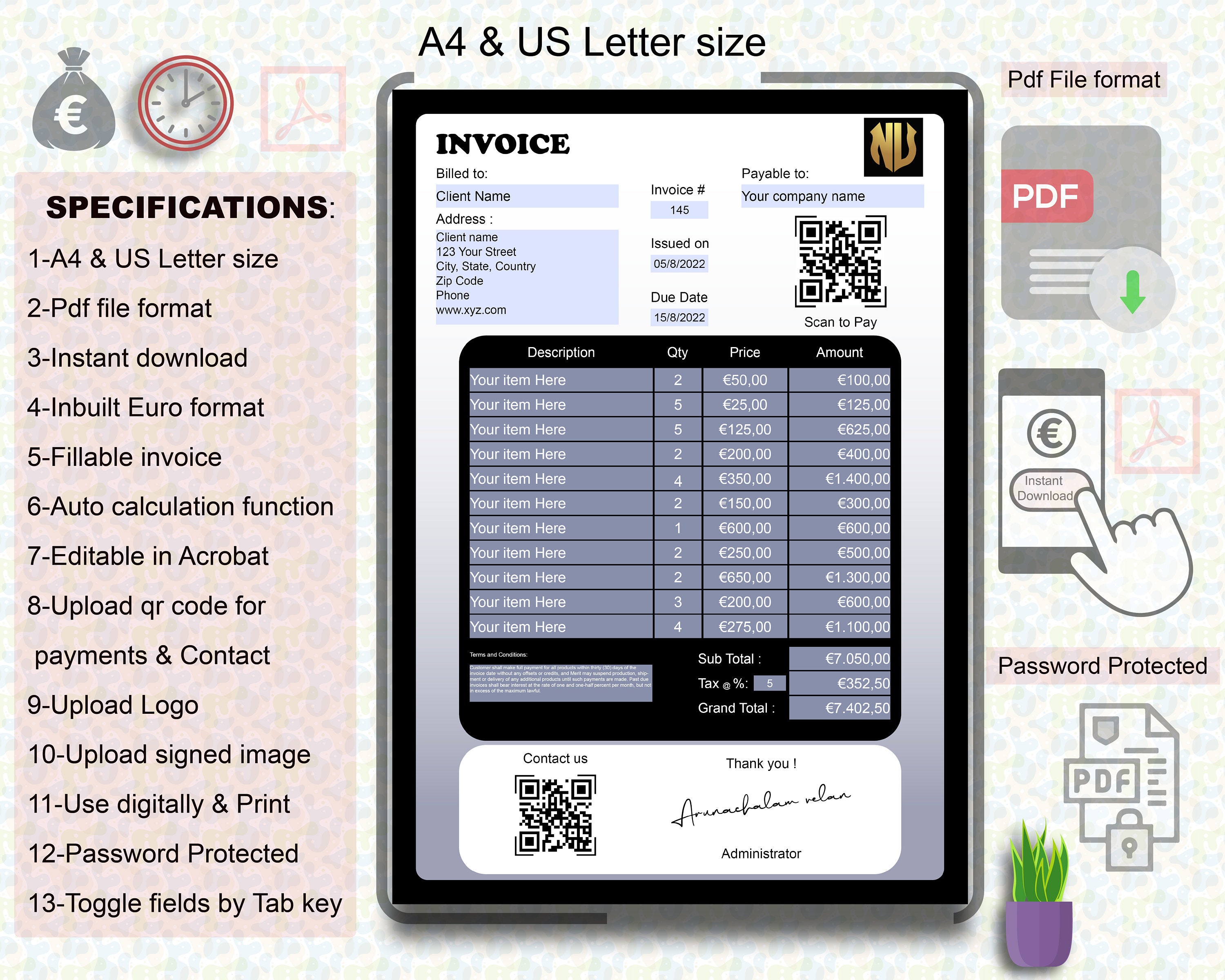 Invoice | Fillable Pdf Invoice Template | Built-in With Euro Currency ...
