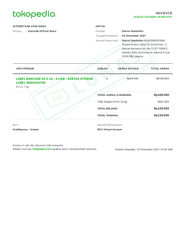Invoice Label Barcode Tokopedia | PDF