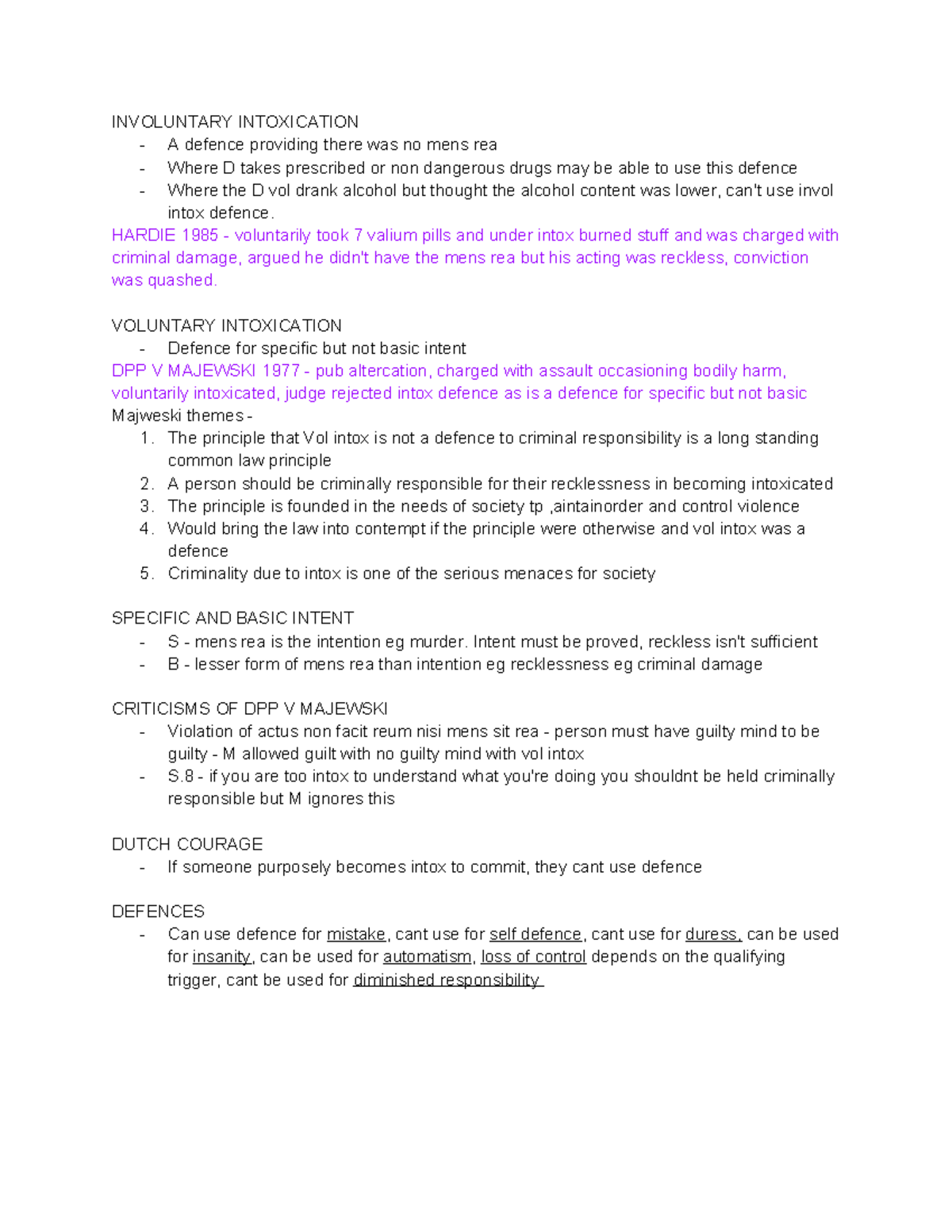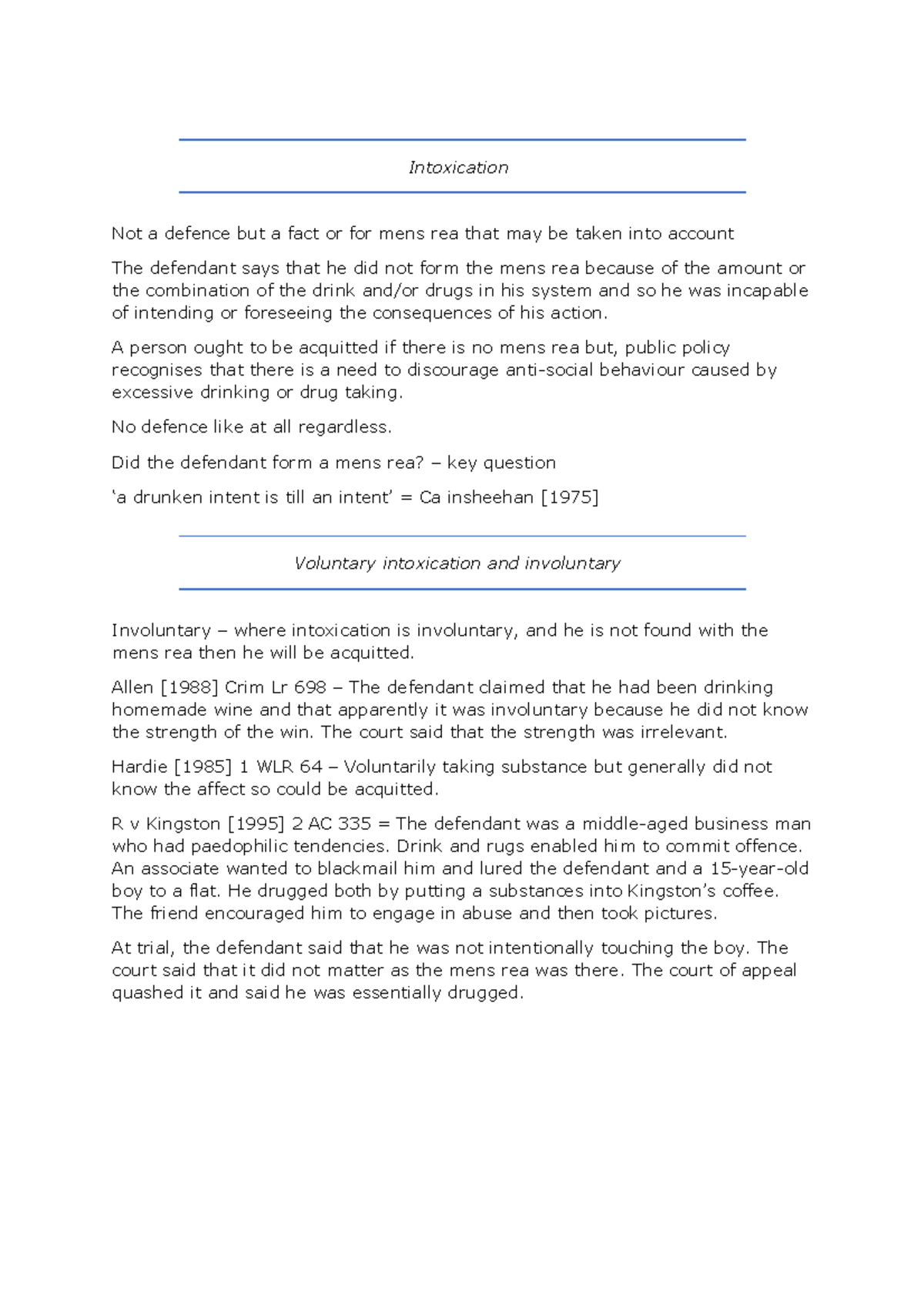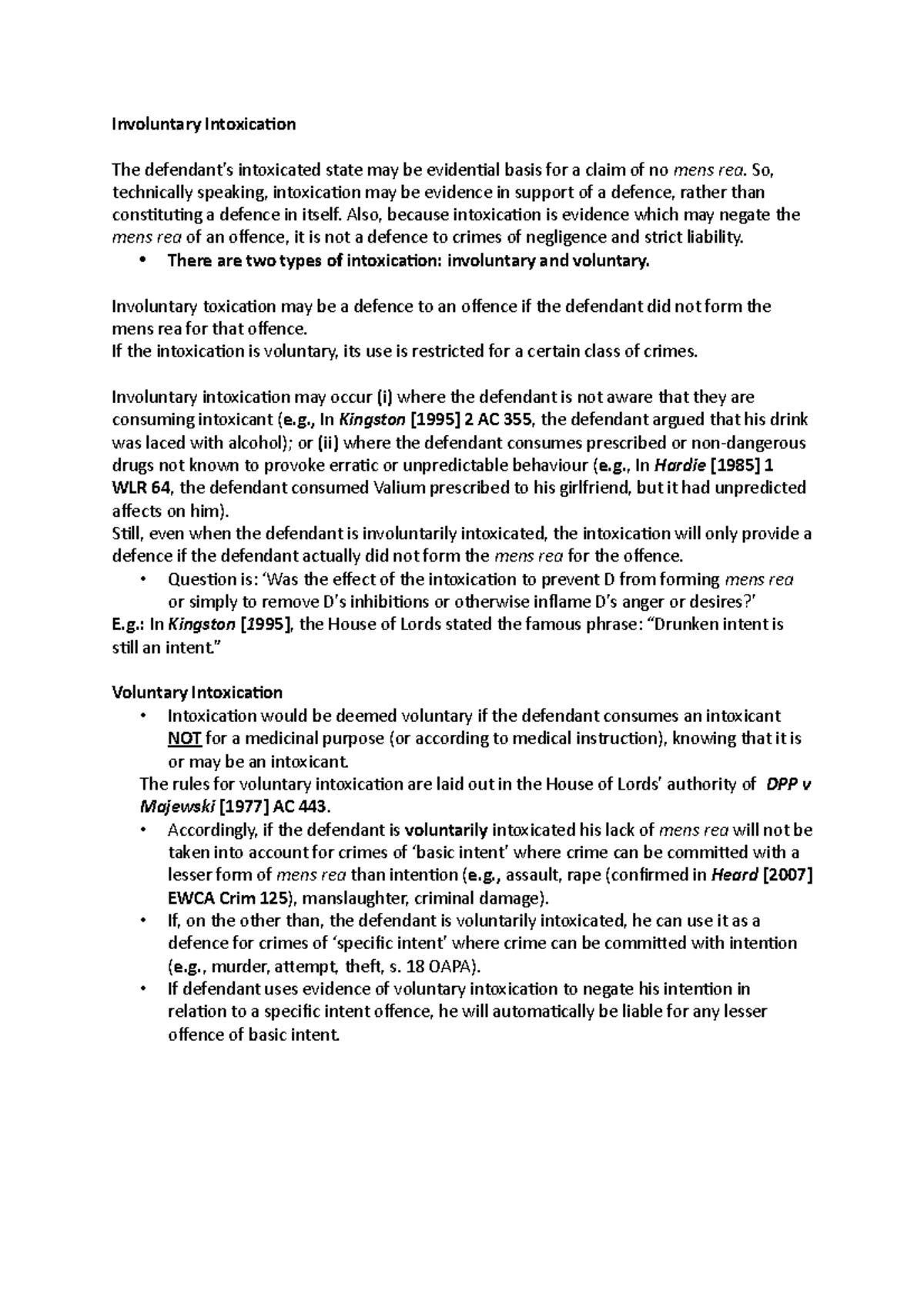 Defences - Intoxication revision summary - INVOLUNTARY INTOXICATION A ...